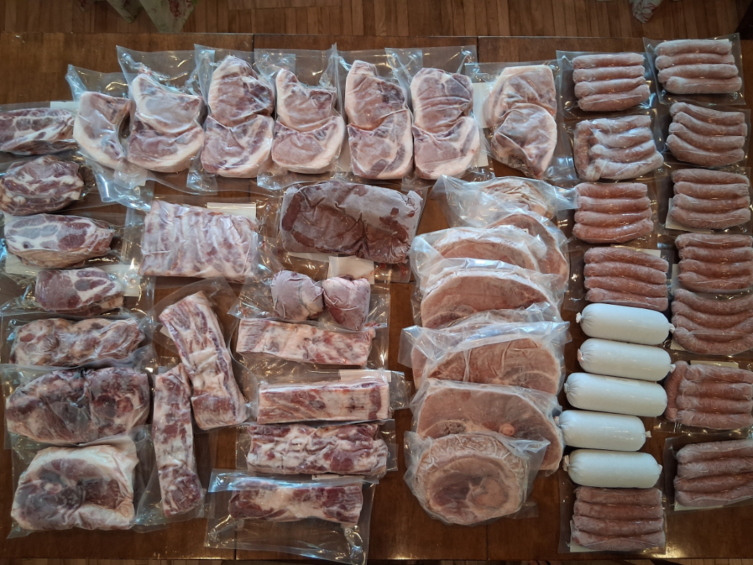 When your hog reaches market weight, it is delivered to a trusted local processor for custom butchering. With a half hog, you still receive a wide range of cuts – chops, roasts, ribs, ground pork, and your choice of sausage blends – all tailored to your preferences through your cut‑sheet. If you’re new to custom pork, we’re happy to help you navigate the options and plan for freezer space.